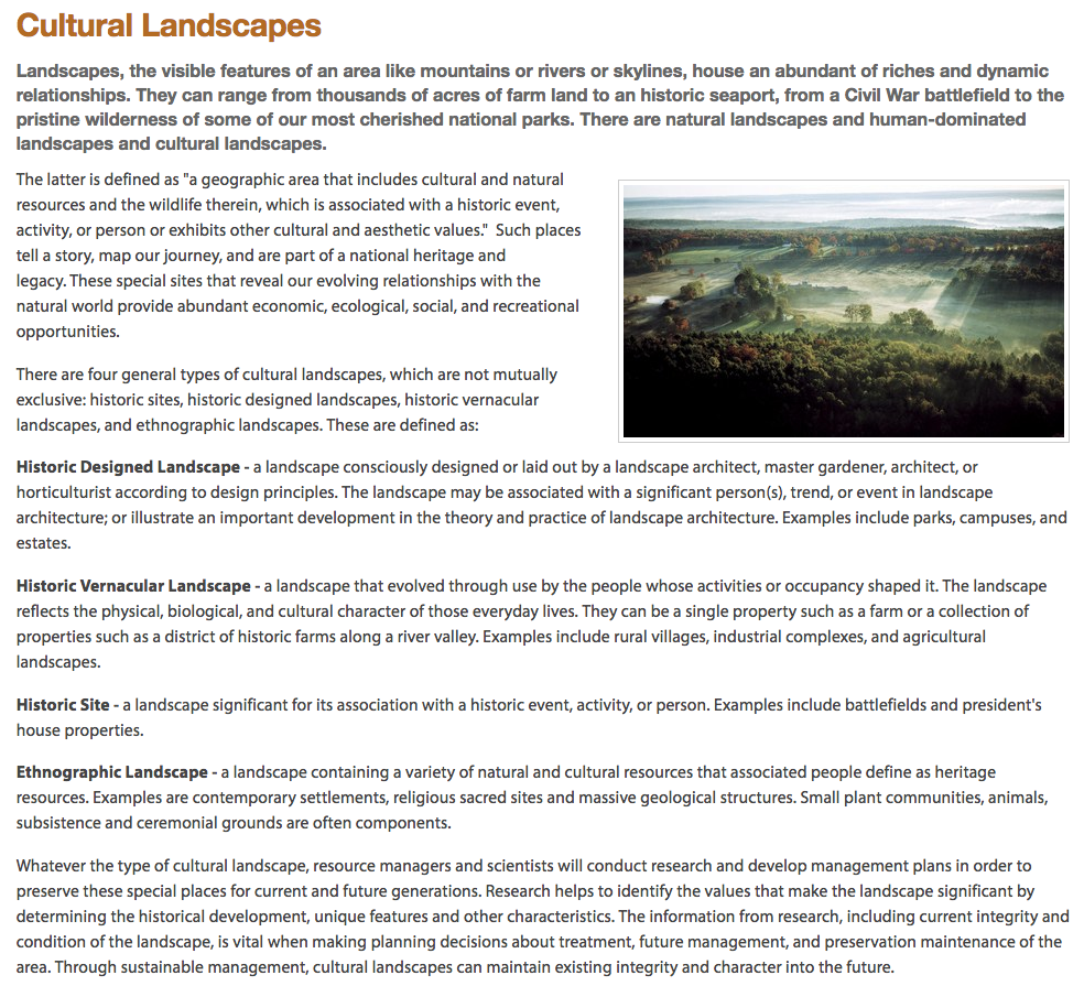 Landscapes, the visible features of an area like mountains or rivers or skylines, house an abundant of riches and dynamic relationships. They can range from thousands of acres of farm land to an historic seaport, from a Civil War battlefield to the pristine wilderness of some of our most cherished national parks. There are natural landscapes and human-dominated landscapes and cultural landscapes.