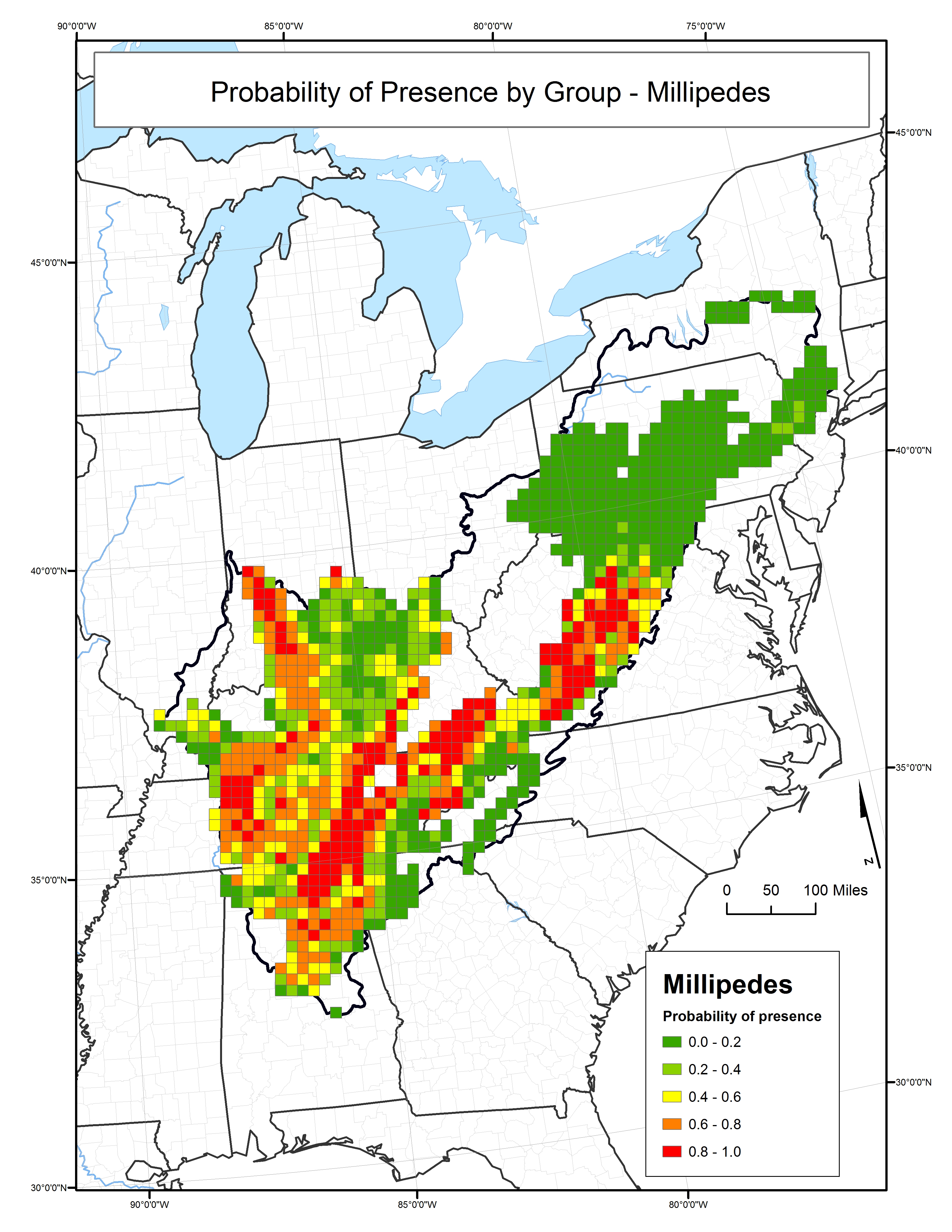 This map depicts the probability of presence for species within the millipede group throughout the Appalachian LCC region. Red areas have the highest probability of presence.