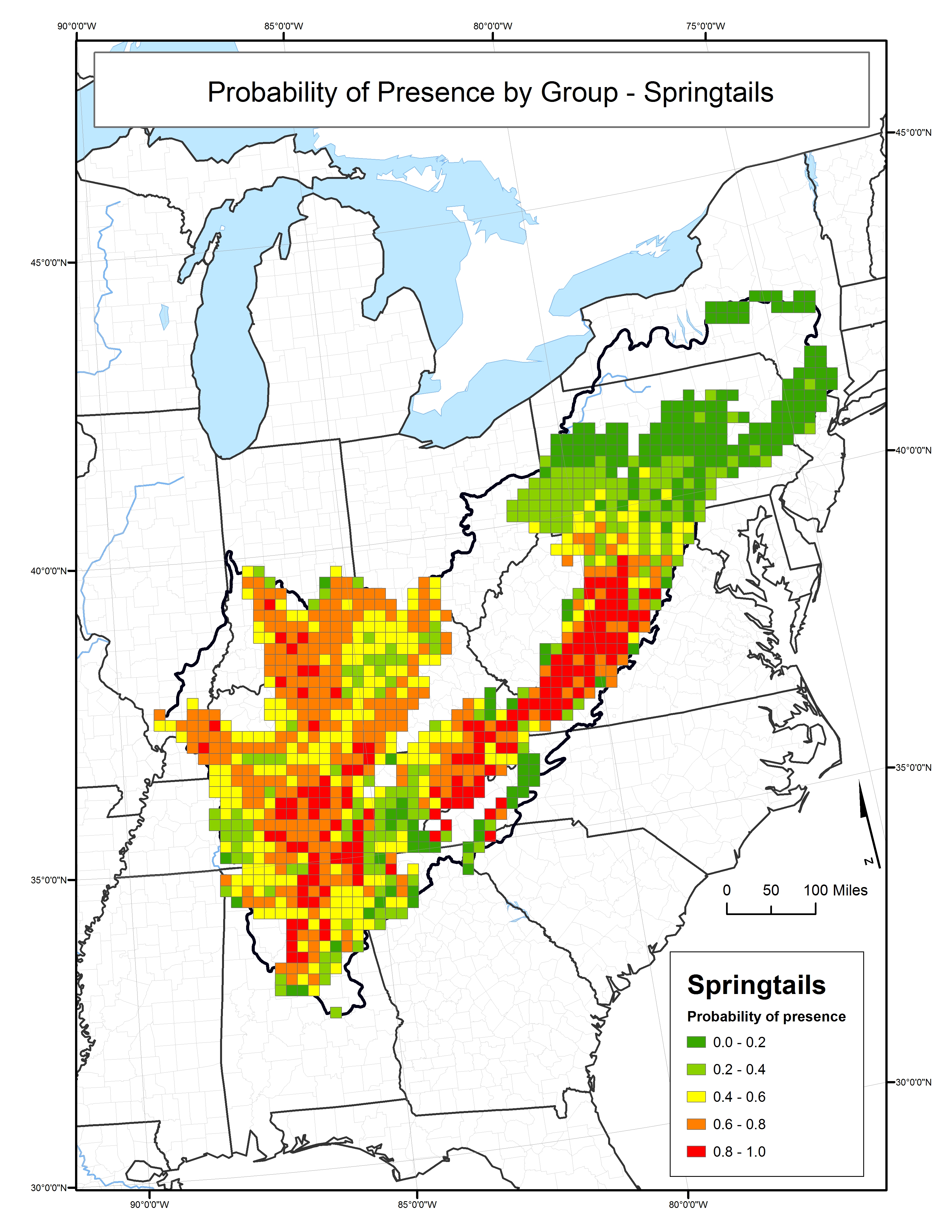 This map depicts the probability of presence for species within the springtail group throughout the Appalachian LCC region. Red areas have the highest probability of presence.