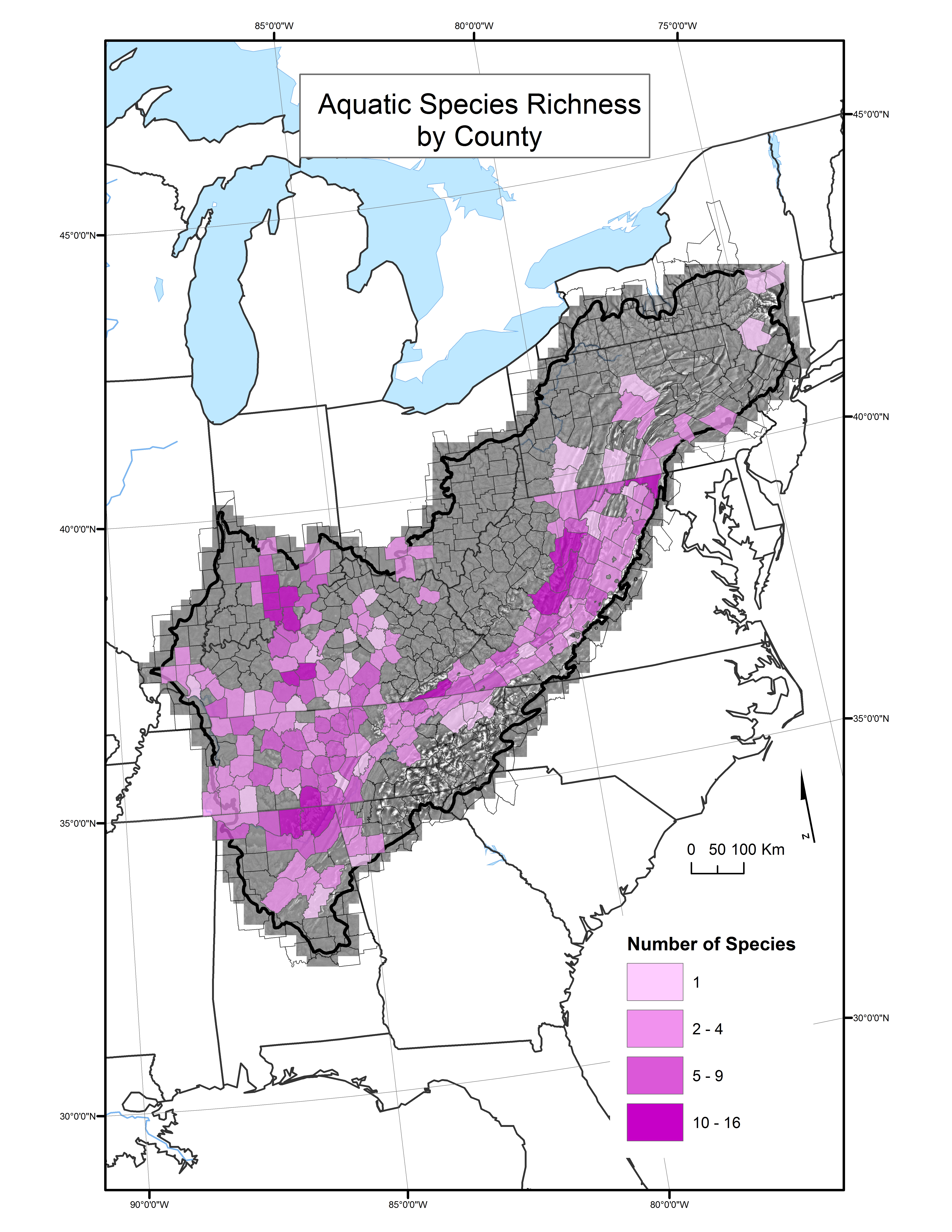 Distribution of aquatic species at the county scale throughout the Appalachian LCC region.